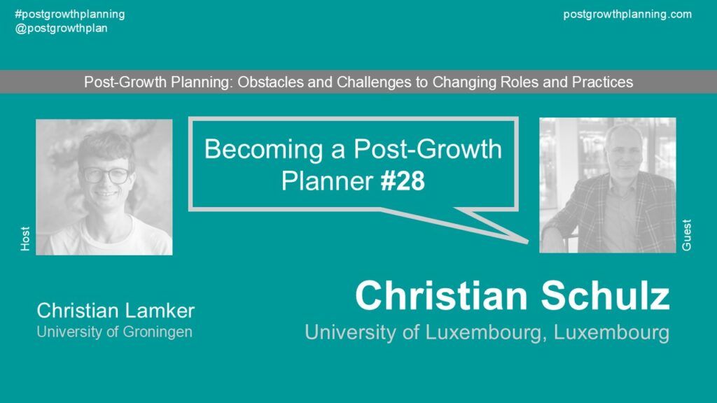 Episode #28 of “Becoming a post-growth planner: obstacles and challenges to changing roles and practices” with Prof Dr Christian Schulz (University of Luxembourg). In conversation with Dr Christian Lamker (University of Groningen, the Netherlands).